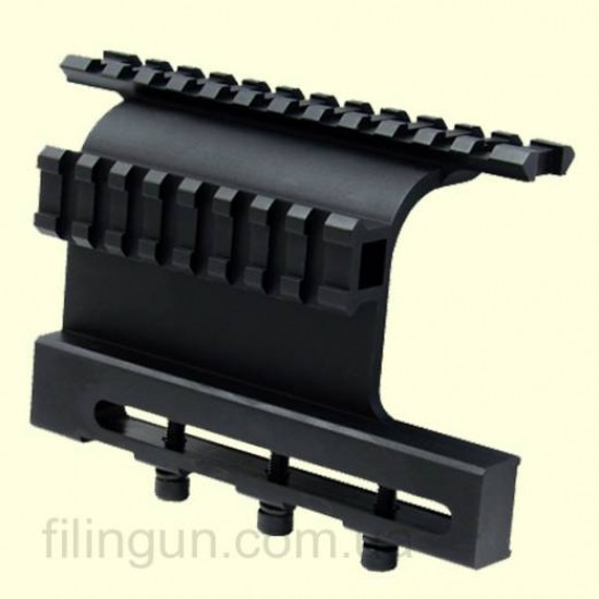 База крепления американской компании Leapers UTG Gen 3 AK Double Rail Side Mount MNT-973 позволяет оснастить автоматическую винтовку Калашникова (АК и ее модификации) дополнительными прицельными приспособлениями и аксессуарами с посадочным местом Weaver/Picatinny. База приспособлена для установки прицелов, изготовленных по стандарту STANAG (военный стандарт НАТО) и оснащена двумя рельсами: с 12-ю (для прицела) и 8-ю (для навесных аксессуаров) пазами. Монолитная конструкция отлива выполнена из высококачественного алюминиевого сплава.