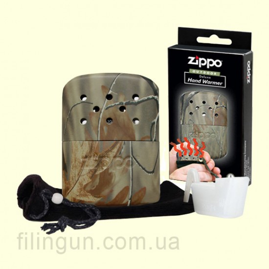 Каталитическая бензиновая грелка Zippo 40290 Hand Warmer Realtree. Работа грелки основывается на принципе безпламенного, каталитического окисления паров бензина на горячем платиновом электроде. В холодную пору года она вас согреет в походе, на рыбалке, охоте. Благодаря своей компактности она удобно разместится в руке, кармане штанов, так же пригодится вам для просушки обуви. Каталитическая бензиновая грелка Zippo Hand Warmer 40290 комплектуется тканевым мешочком и дозатором, при помощи которого вы сможете зарядить грелку на 6 или 12 часов работы.