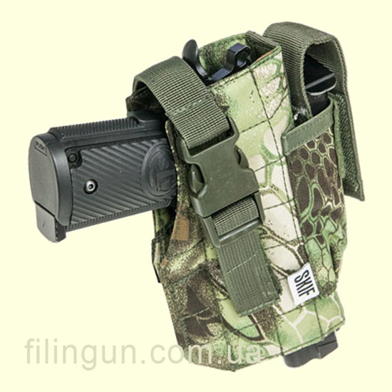 Синтетическая кобура Skif Tac пистолетная для Форт 14/17 Kryptek green подходит для крупных пистолетов, таких как Форт 14, Форт 17, АПС, Беретта 92 или же Кольт 1911. Крепится она на стропы Molle. Пистолет в кобуре фиксируется с помощью застёжки Fastex, и имеет возможность регулировки с помощью липучки Velcro. Также она оборудована отделением для запасного магазина со съемным клапаном на липучке Velcro. Материал - полиэстер.