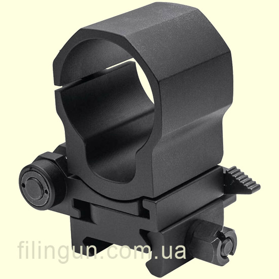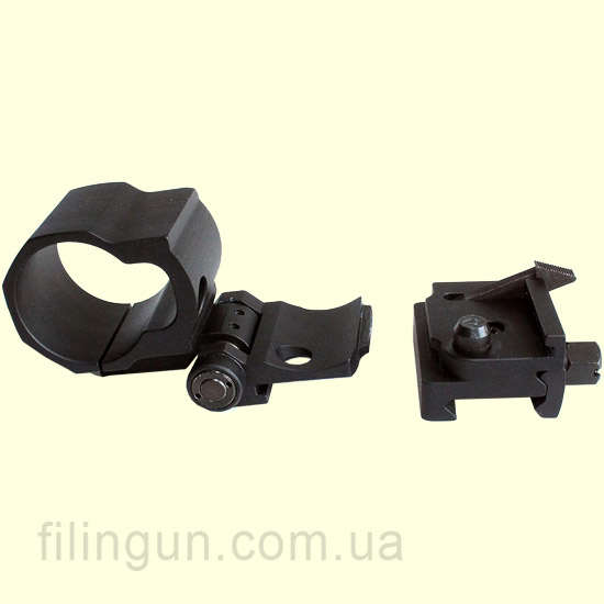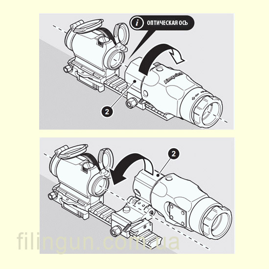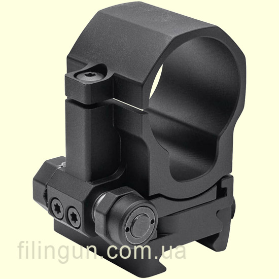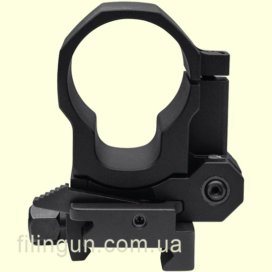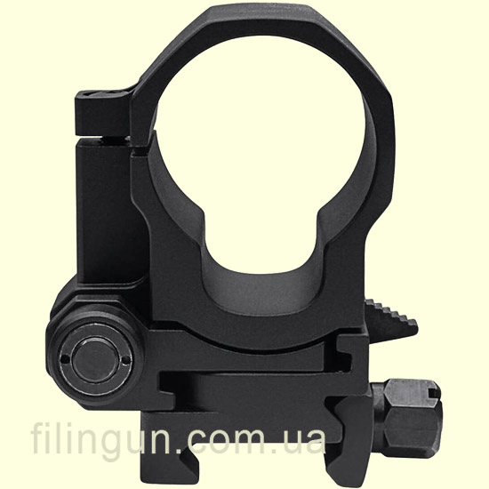 Быстросъемный механизм: FlipMount оснащен быстросъемным механизмом, который позволяет мгновенно перевести магнифер из рабочего положения в нерабочее и обратно. Это особенно полезно в ситуациях, требующих быстрой смены вида прицела. Кольцо с установленным прибором легко снимается с основания: нужно всего лишь отжать подпружиненный рычажок вниз и повернуть его в сторону примерно на 70 градусов.