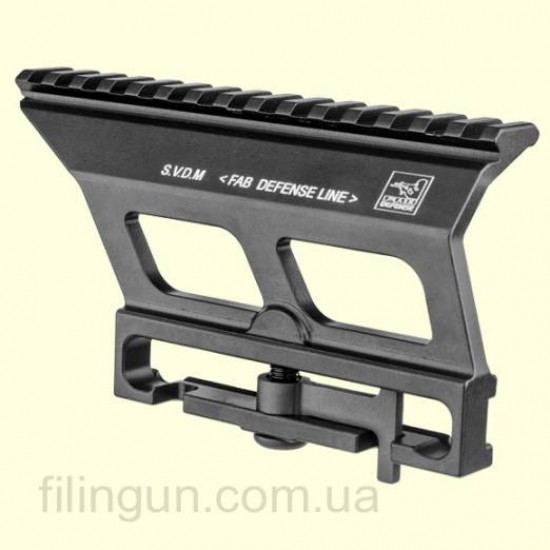 Быстросъемный боковой кронштейн израильской компании FAB Defense SVDM Drogunov Sniper Rifle Scope Mount позволяет оснастить карабин на базе СВД/Тигр дополнительными прицельными приспособлениями и аксессуарами с посадочным местом Weaver/Picatinny. Оборудован надежной системой крепления посредством поворотного флажка. Изготавливается из цельной алюминиевой заготовки марки 6061 T6, обеспечивая прочность и легкость конструкции. Не мешает использованию механических прицельных приспособлений.