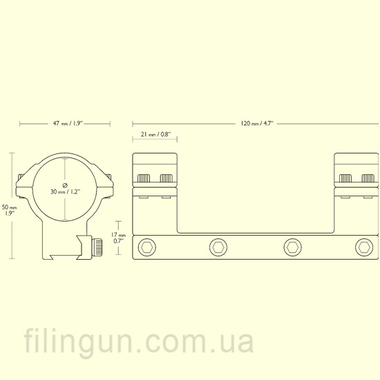 | Габаритные размеры | Общая высота: 50 мм; длина: 120 мм; высота от планки до центра: 35 мм; внутреннее расстояние между кольцами моноблока: 80 мм |