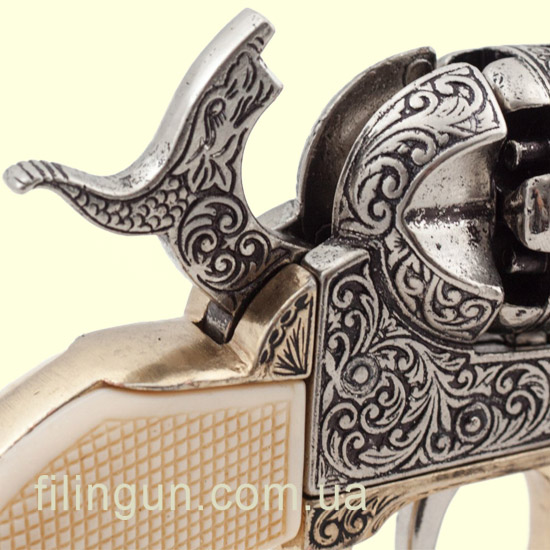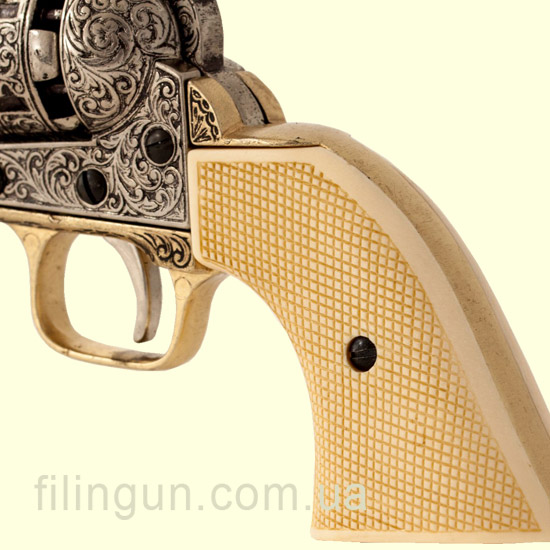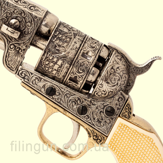 Denix, известный своими точными и детализированными репликами, выполнил Colt 1851 с большим вниманием к деталям. Макет изготовлен из металла с пластиковыми накладками под кость на рукояти, что придает ему аутентичность и вес, близкий к оригинальному револьверу. Гравировка на барабане, характерная для моделей Colt 1851, также присутствует, добавляя модели исторической достоверности.