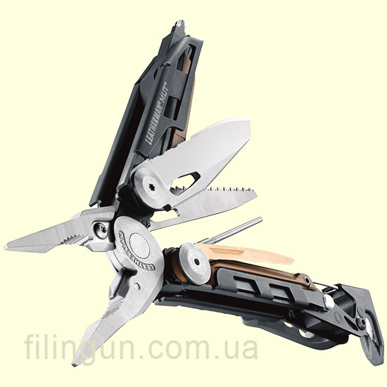Leatherman MUT - первый мультиинструмент разработанный для решения как тактических, так и практических задач военных. Набор насчитывает 16 инструментов, в первую очередь, предназначенных для обслуживания огнестрельного оружия: ключ для разборки винтовки, шомпол, отвертки и выколотки, обжимка для детонаторов, молоток, кусачки, пила, а так же острый клинок из стали 420HC с частичной серрейторной заточкой. Большинство деталей сменные, что дает возможность при помощи отвертки заменить их в случае износа, а сама конструкция предполагает однорукий доступ ко всем основным инструментам с фиксаторами для защиты от случайного закрытия при работе. Рукоятки и корпус тула изготовлены из нержавеющей стали, а эргономичность конструкции позволяет работать с инструментом даже в перчатках. Мультитул Leatherman MUT 850012N комплектуется нейлоновым чехлом с креплением Molle коричневого цвета, съемной титановой клипсой, а так же набором бит, благодаря которым, значительно расширяется его использование.