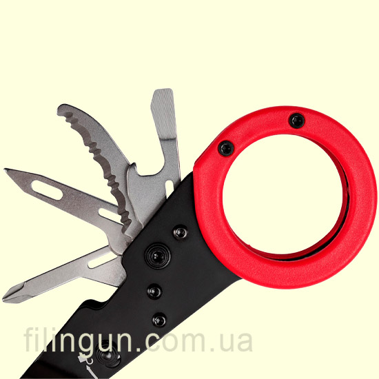 Мультитул включает в себя также стропорез для резки веревки или шнура, а также две отвертки с плоской и крестовой частью, что делает его универсальным инструментом для ремонтных работ или мелких наружных задач. Удобные рукоятки с антивибрационным покрытием обеспечивают комфортное и надежное сцепление при использовании.