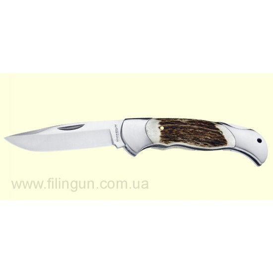 Это традиционный складной охотничий нож. Клинок выполненный из нержавеющей стали, позволяет выполнять любую работу возложенную на неё. Накладки на ручке выполнены из оленьего рога, что добавляет элегантности ножу. Механизм обеспечивает максимальную безопасность при использовании