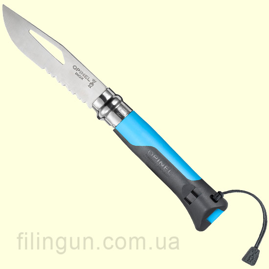 Нож Opinel №8 Outdoor Blue относится к линейке Tradition подраздел Specialists. Данная модель ножа подходит для спортивных мероприятий на море и горах: альпинизм, пара планеризм, для походов, спелеология, парусный спорт, морской деятельности, на охоте или на рыбалке. В ноже Opinel №8 Outdoor ц:синий используется нержавеющая сталь Sandvik 12C27. Толщина стали была изменена с 2 миллиметров на 2,5 миллиметра, что сделало клинок более прочным. Так же на клинке появилась полусеррейторная заточка. Сам серрейтор занимает на клинке 35 миллиметров, что позволяет без больших усилий перерезать веревки или же канаты любых материалов. Как и в предыдущих версиях фирмы Opinel в данной модели ножа так же присутствует запатентованная система Virobloc для блокировки лезвие в открытом или закрытом положении. Компания Opinel в ноже Opinel №8 Outdoor Blue использует не деревянные заготовки рукояток а высококачественный пластик который устойчив к воздействию экстремальных температур от -40 С до + 80 С. На окончании рукоятки ножа Opinel №8 Outdoor Blue присутствует свисток мощностью 110 децибел который слышно на расстоянии более 300 метров. Так же присутствует эластичный темляк с возможностью закрепить нож на поясе или же рюкзаке. Нож понравился многим у нас в стране.