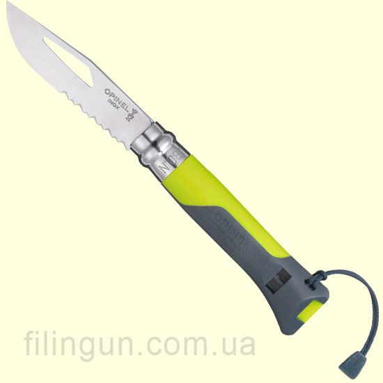 Нож Opinel №8 Outdoor Green относится к линейке Tradition подраздел Specialists. Данная модель ножа подходит для спортивных мероприятий на море и горах: альпинизм, пара планеризм, для походов, спелеология, парусный спорт, морской деятельности, на охоте или на рыбалке. В ноже Opinel №8 Outdoor Vert используется нержавеющая сталь Sandvik 12C27. Толщина стали была изменена с 2 миллиметров на 2,5 миллиметра, что сделало клинок более прочным. Так же на клинке появилась полусеррейторная заточка. Сам серрейтор занимает на клинке 35 миллиметров, что позволяет без больших усилий перерезать веревки или же канаты любых материалов. Как и в предыдущих версиях фирмы Opinel в данной модели ножа так же присутствует запатентованная система Virobloc для блокировки лезвие в открытом или закрытом положении. Компания Opinel в ноже Opinel №8 Outdoor ц:зеленый использует не деревянные заготовки рукояток а высококачественный пластик который устойчив к воздействию экстремальных температур от -40 С до + 80 С. На окончании рукоятки ножа Opinel №8 Outdoor Green присутствует свисток мощностью 110 децибел который слышно на расстоянии более 300 метров. Так же присутствует эластичный темляк с возможностью закрепить нож на поясе или же рюкзаке. Нож понравился многим у нас в стране.