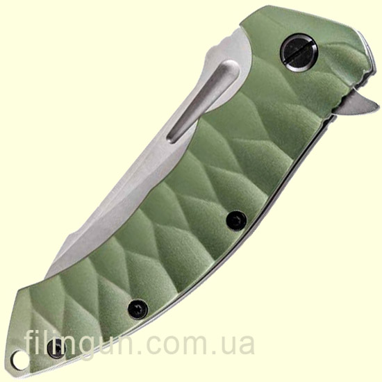 Наш интернет магазин рад предложить вашему вниманию нож Skif 421G Shark GRTS/SW, Green. Этот небольшой, складной нож, однозначно привлечет внимание своим грозным видом. Skif 421G Акула - нож флиппер, что позволяет открывать его одним движением как правой, так и левой руки. Многофункциональный клинок длиной 9,4 см и толщиной в 3 мм имеет удобную подпальцевую выемку. Нержавеющая сталь марки 8Cr13MoV с финишной обработкой клинка Stonewash, обладает хорошей коррозионной стойкостью, а так же славится длительной сохранностью своей режущей кромки. Механизм блокировки клинка Frame Lock, со стабилизатором от выгибания в противоположную сторону, обеспечивает надёжность фиксирования в рабочем положении и безопасность удержания в руке. Комбинированная, эргономичная рукоять ножа Skif Shark 421G выполнена из зеленого анодированного алюминия с одной стороны и анодированной нержавеющей стали с другой, на торце имеет вытянутую форму, что позволяет использовать нож в качестве стеклобоя. Так же стоит отметить наличие удобной односторонней клипсы и темлячного отверстия.