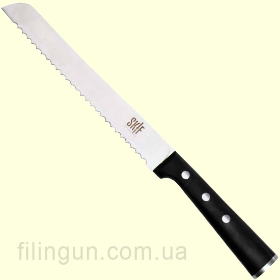 Наш интернет магазин рад предложить вашему внимаю серию кухонных ножей от украинской торговой марки Skif. Нож Skif Bread Knife - специальный нож для нарезки хлеба, пирогов и тортов, позволяет приготовить не тольно вкусный, но и эстетично - красивый обед. Аккуратные, ровные ломтики обеспечит длинное тонкое лезвие из нержавеющей стали марки 8Cr13MoV с волнистой (серрейторной) заточкой, для реза даже самого свежего и мягкого хлеба. Рукоять из полимерного материала обеспечивает комфорт при использовании и безопасность при удержании даже мокрой рукой. Кухонная линейка ножей Skif подходит для работ как в домашних условия, так и для профессионального использования в приготовлении пищи, являясь разумной альтернативой в выборе качества и цены на изделие.