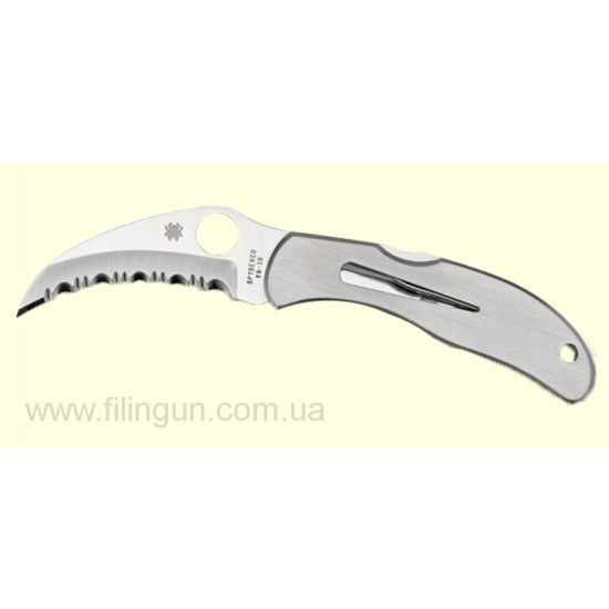 Складной нож Harpy C08S от компании Spyderco (Спайдерко). Нож был разработан для рыбной промышленности, так как изогнутое лезвие в виде когтя орла да плюс серрейторная заточка клинка великолепно справлялась с пере резанием канатов веревок сеток на расстоянии вытянутой руки. Нож Spyderco Harpy C08S имеет клинок из японской коррозионностойкой стали VG-10 разработанной компанией Takefu Special Steel Co., Ltd. (Япония). 13 миллиметровое отверстие на лезвии ножа позволит вам быстро и эффективно открыть нож как правой, так и левой рукой. Рукоятка ножа Spyderco Harpy C08S изготовлена из листовой нержавеющей стали. Клипса для удобства пользования потребителя позволяет носить его в кармане или на поясе, предотвратит тем самым потерю вашего любимого ножа. Если вам понравился данный нож товар, вы можете его купить у нас в интернет-магазине Filingun.com.ua сделав заказ через форму сайта или же позвонив по телефонам указанных в шапке сайта.