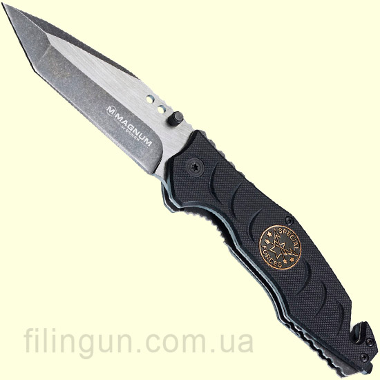 Нож Boker Magnum Tango Romeo 01RY221 – надежный спасательный нож с подпружиненным лезвием формы Tanto из нержавеющей стали марки 440А которое открывается с помощью двухстороннего шпенька и надежно фиксируется замком Linerlock. Нож оборудован стеклобоем и стропорезом. Рукоятка обеспечивает надежный и удобный хват и изготовлена из материала G-10. Также присутствует зажим для кармана для удобства при переноске.