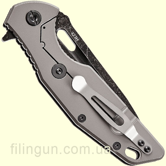 Открывается одной рукой с помощью подпальцевой выемки или флиппера, а шарикоподшипник обеспечивает превосходно плавный ход при открытии. Форма клинка — это сочетание Drop-Point и S-образного клинка и имеет длину 9,7 см и толщину в 3 мм из нержавеющей стали марки 9Cr18MoV что лучше, чем у предыдущих моделей, обладает хорошей коррозионной стойкостью, отлично держит заточку и легко правится, а также финишную обработку Black Stonewash которая убережет от незначительных потертостей и царапин при частой эксплуатации.