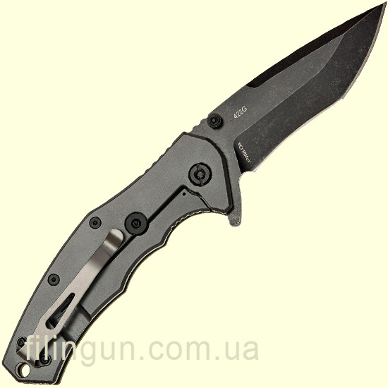 Открывается одной рукой с помощью двухстороннего шпенька или флиппера, а шарикоподшипник обеспечивает превосходно плавный ход при открытии. Форма клинка — это сочетание Drop-Point и S-образного клинка и имеет длину 9,4 см и толщину в 3 мм из нержавеющей стали марки 9Cr18MoV что лучше, чем у предыдущих моделей, обладает хорошей коррозионной стойкостью, отлично держит заточку и легко правится, а также финишную обработку Black Stonewash которая убережет от незначительных потертостей и царапин при частой эксплуатации.