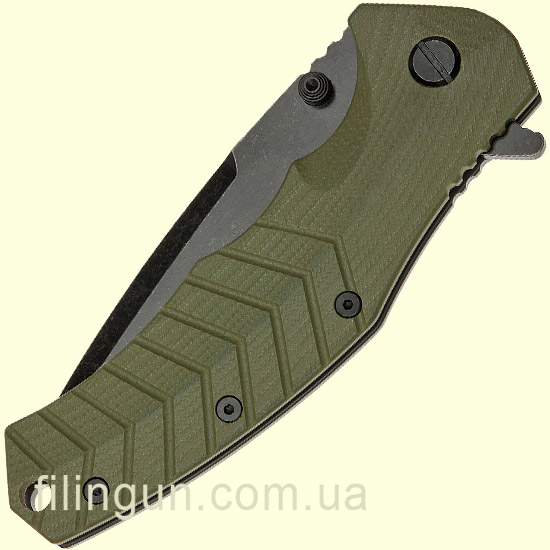Накладка рукояти выполнена из крепкого композитного материала G-10 оливкового цвета и позволяет удерживать нож в перчатках или даже в влажной руке. Также стоит отметить наличие удобной съемной односторонней клипсы позволяющей носить его даже в кармане штанов и темлячного отверстия.