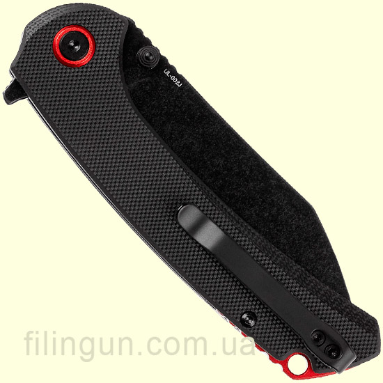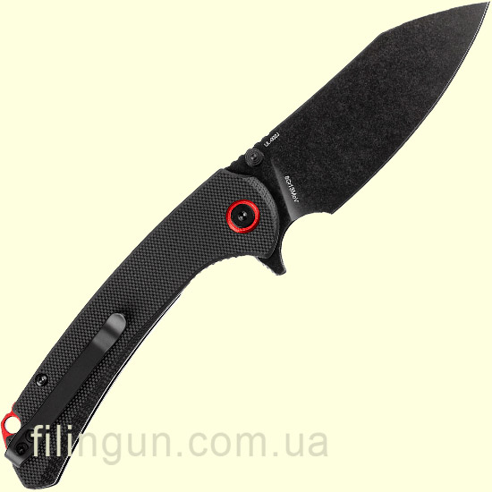 Рукоять оснащена накладками из прочного композитного материала G-10 черного цвета. Текстура обеспечивает уверенный хват даже влажной рукой, а эргономичная форма снижает усталость при длительной работе. Нож дополнен съемной двухпозиционной клипсой, что позволяет удобно носить его в кармане, а также отверстием под темляк для индивидуальной настройки ношения.