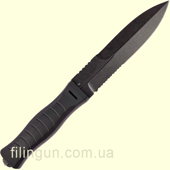 Клинок с обоюдоострым профилем Spear Point изготовлен из высококачественной инструментальной стали D2 с твердостью до 60 HRC и покрытием Stonewash обеспечивает отличную стойкость к коррозии и сохраняет остроту в течение долгого времени. Полусеррейторная заточка предназначена для мгновенного разрезания различных материалов.
