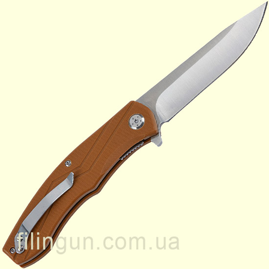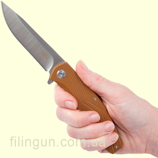 Складной нож Skif Plus Eleven Tan имеет клинок формой Drop Point с толщиной обуха 3,1 миллиметра и изготовленного и нержавеющей стали марки 3Cr13MoV. Накладки на рукоятке изготовлены из прочного стеклотекстолита G10 с зигзагообразной проточкой, обеспечивающие великолепное и надежное удержания ножа, также присутствует клипса для переноски его в кармане брюк. Замок используется Liner-Lock, а с помощью флиппера и шарикоподшипника изделие можно быстро привести в рабочее состояние. Модель относится к EDC и интересна тем, что она имеет определённый шарм и прекрасно подойдет для повседневного ношения.