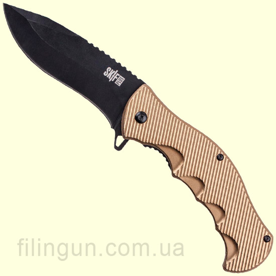 Нож Skif Plus Funster Gold в переводе с англ. “Шутник” имеет функциональный S образный клинок. Рукоятка изготовлена из алюминия, имеет насечки для более комфортного удержания ножа, а также углубления для пальцев и ярко выраженные упоры на обухе под большой палец. Односторонняя клипса позволит закрепить нож на ремне. Замок используется Liner lock, а с помощью флиппера, а также системе Assist (подпружиненный клинок) изделие можно быстро привести в рабочее состояние.