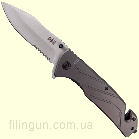Нож Skif Plus Jolly SF Serr превосходный инструмент для повседневного ношения или же экстремальных ситуациях. Рукоятка изготовлена из алюминия, оборудована стропорезом и стеклобоем. Ярко выраженные упоры на обухе и рукоятке под большой палец. Односторонняя клипса позволит закрепить нож на ремне. Замок используется Liner lock, а с помощью двухстороннего шпенька и флиппера, а также системе Assist (подпружиненный клинок) изделие можно быстро привести в рабочее состояние.