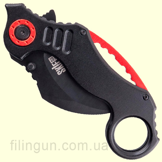 Нож Skif Plus Tiger Claw Black имеет клинок серповидной формы. Данный тип клинка использовался жителями Суматры как инструмент для повседневных работ или же для самозащиты. В переводе Tiger Claw обозначает коготь тигра. Рукоятка имеет отверстие, с помощью которого можно использовать нож с любым хватом. Сама рукоять выполнена с алюминия, а клинок имеет черное покрытие. Замок используется Liner lock, а с помощью двухстороннего шпенька и флиппера изделие можно быстро привести в рабочее состояние.