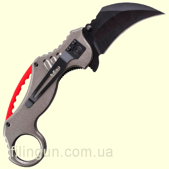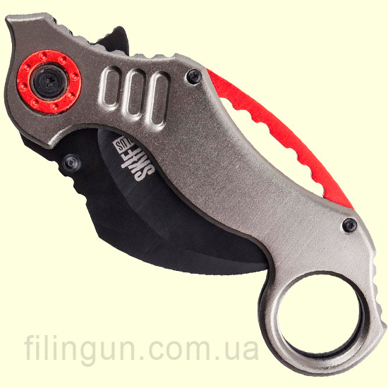 Нож Skif Plus Tiger Claw Grey имеет клинок серповидной формы. Данный тип клинка использовался жителями Суматры как инструмент для повседневных работ или же для самозащиты. В переводе Tiger Claw обозначает коготь тигра. Рукоятка имеет отверстие, с помощью которого можно использовать нож с любым хватом. Сама рукоять выполнена с алюминия, а клинок имеет черное покрытие. Замок используется Liner lock, а с помощью двухстороннего шпенька и флиппера изделие можно быстро привести в рабочее состояние.