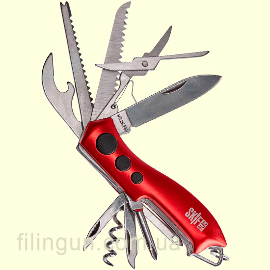 Многофункциональный нож Skif Plus Wavy Red это полезный небольшой девайс, который поможет вам в самых сложных ситуациях, с которыми вы можете столкнутся. Изготовлен из нержавеющей стали марки 420 и имеет длину 9,6 см и вес всего 114 грамм. Накладки изготовлены из алюминиевого сплава с анодированием с пластмассовыми вставками.
