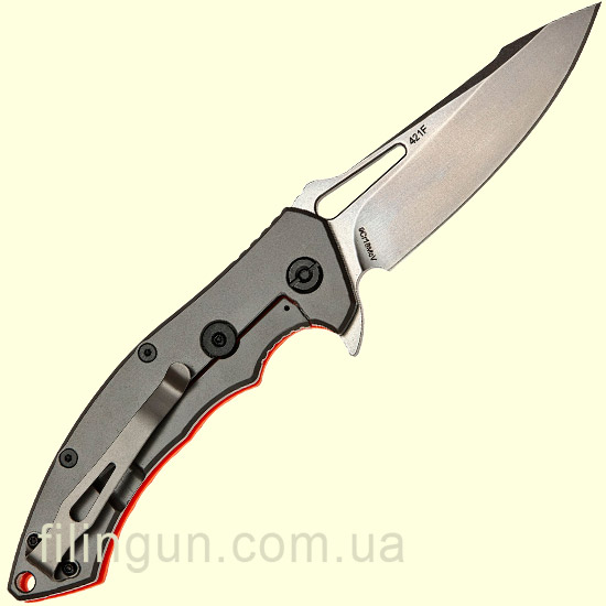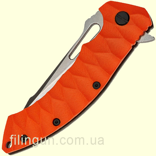Накладка рукояти выполнена из крепкого композитного материала G-10 оранжевого цвета и позволяет удерживать нож в перчатках или даже в влажной руке. Также стоит отметить наличие удобной съемной односторонней клипсы позволяющей носить его даже в кармане штанов, а также присутствует отверстие для темляка.