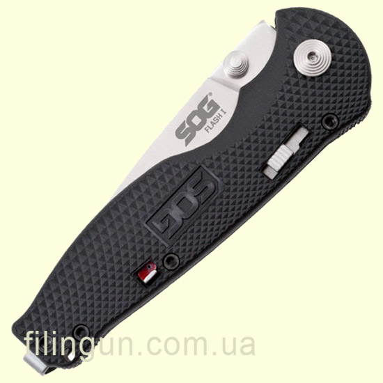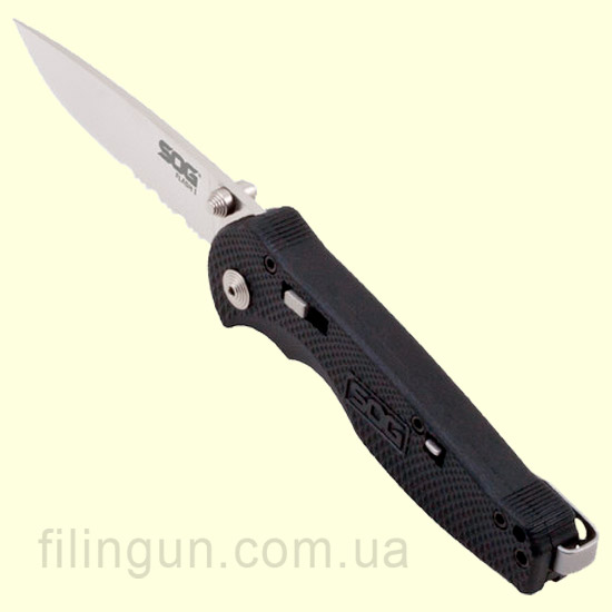 Наш интернет магазин рад предложить вашему вниманию складной нож SOG Flash I Partially Serrated Satin (FSA97-CP). Младший брат семейства ножей Flash II сохранил в себе все те же качества, что и полноразмерная версия, просто в более компактном виде. Модель оснащена механизмом блокировки клинка Piston Lock, а благодаря технологии ускоренного открытия SOG Assisted Technology - нож за доли секунд приводится в рабочее положение легким движением одной руки. Клинок с полусеррейторной заточкой длиной 64 мм и толщиной обуха 2.3 мм изготовлен из высококачественной нержавеющей стали AUS-8, обладающей хорошей коррозионной стойкостью, а так же длительным сохранением режущей кромки. Эргономичная рукоять выполнена из термопластика GRN черного цвета и оснащена съемной двухсторонней карманной клипсой.