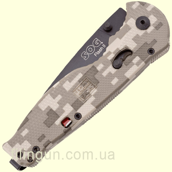 Наш интернет магазин рад предложить вашему вниманию складной нож SOG Flash II Partially Serrated Black TiNi Digi Camo (DFSA98-CP). Простая и в тоже время надежная конструкция ножа, позволяет использовать его как в защитных целях, так и в городских условиях для повседневного ношения. Модель оснащена механизмом блокировки клинка Piston Lock, а благодаря технологии ускоренного открытия SOG Assisted Technology - нож за доли секунд приводится в рабочее положение легким движением одной руки. Клинок с полусеррейторной заточкой длиной 89 мм и толщиной обуха 3.2 мм изготовлен из высококачественной нержавеющей стали AUS-8, обладающей хорошей коррозионной стойкостью, а так же длительным сохранением режущей кромки. Эргономичная рукоять выполнена из термопластика GRN цвета Digital Camo и оснащена съемной двухсторонней карманной клипсой.