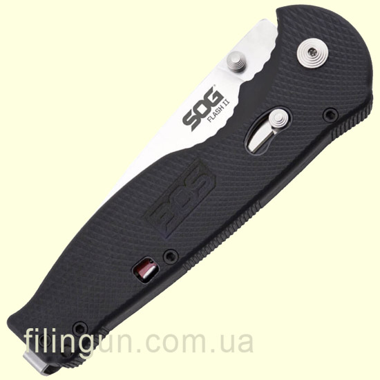 Наш интернет магазин рад предложить вашему вниманию складной нож SOG Flash II Straight Edge Satin (FSA8-BX). Простая и в тоже время надежная конструкция ножа, позволяет использовать его как в защитных целях, так и в городских условиях для повседневного ношения. Модель оснащена механизмом блокировки клинка Piston Lock, а благодаря технологии ускоренного открытия SOG Assisted Technology - нож за доли секунд приводится в рабочее положение легким движением одной руки. Клинок длиной 8.9 см и толщиной в 3.3 мм изготовлен из высококачественной нержавеющей стали AUS-8, обладающей хорошей коррозионной стойкостью, а так же длительным сохранением режущей кромки. Эргономичная рукоять выполнена из термопластика GRN черного цвета и оснащена съемной двухсторонней карманной клипсой.