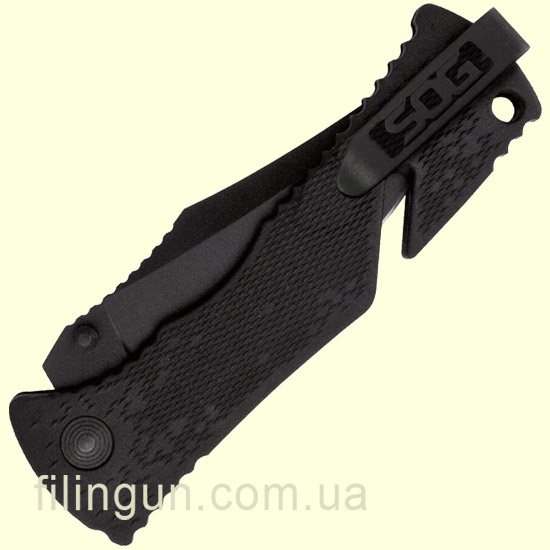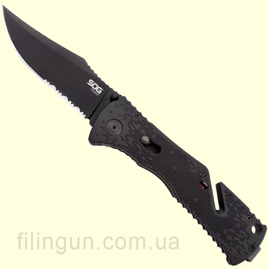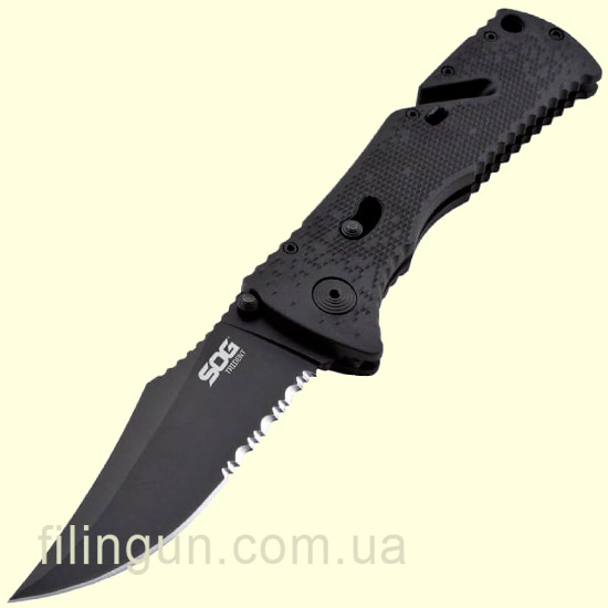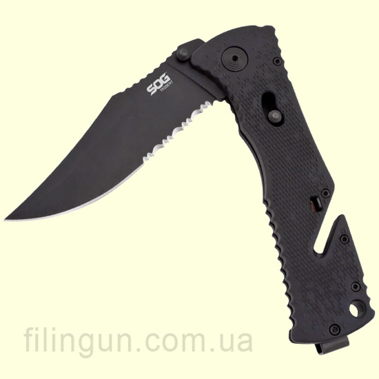 Наш интернет магазин рад предложить вашему вниманию складной нож SOG Trident Black TiNi (TF1-CP). Разработанный для использования в экстремальных ситуациях нож, в тоже время, имеет простую и надежную конструкцию. Модель оснащена фирменным механизмом блокировки клинка Piston Lock, а так же вкючает запатентованную компанией технологию ускоренного открытия SOG Assisted Technology - нож за доли секунд приводится в рабочее положение легким движением одной руки. Клинок с полусеррейторной заточкой длиной 9.5 см и толщиной в 3.2 мм изготовлен из высококачественной нержавеющей стали AUS-8, обладающей хорошей коррозионной стойкостью и длительным сохранением режущей кромки. Эргономичная рукоять выполнена из термопластика GRN черного цвета, оснащена встроенным стропорезом мгновенного действия и съемной двухсторонней карманной клипсой глубокого ношения.