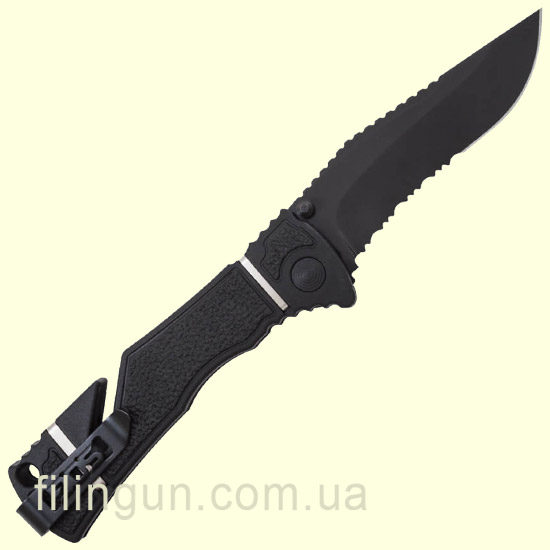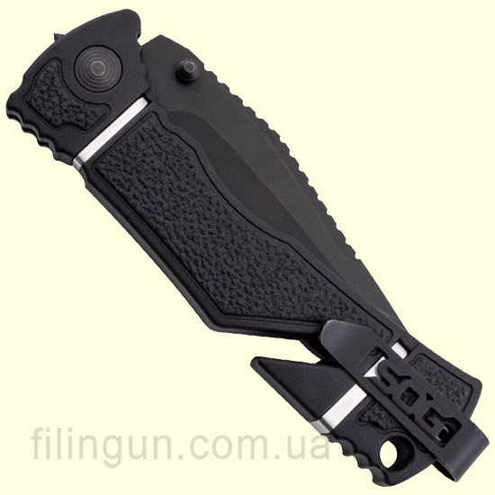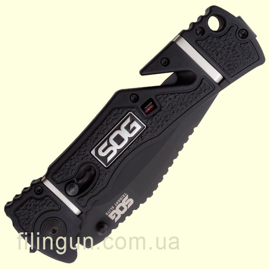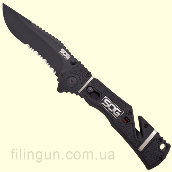 Наш интернет магазин рад предложить вашему вниманию складной нож SOG Trident Elite Serrated Black TiNi (TF106-BX). Разработанный для использования в экстремальных ситуациях нож, в тоже время, имеет простую и надежную конструкцию. Модель оснащена фирменным механизмом блокировки клинка Piston Lock, а так же вкючает запатентованную компанией технологию ускоренного открытия SOG Assisted Technology - нож за доли секунд приводится в рабочее положение легким движением одной руки. Клинок с полусеррейторной заточкой длиной 9.3 см и толщиной в 3 мм изготовлен из высококачественной нержавеющей стали AUS-8, обладающей хорошей коррозионной стойкостью и длительным сохранением режущей кромки. Эргономичная рукоять выполнена из армированного стекловолокном нейлона с прорезиненными вставками, для комфортного удержания ножа даже в мокрой или жирной руке и оснащена встроенным стропорезом мгновенного действия, стеклобоем и съемной двухсторонней карманной клипсой глубокого ношения.