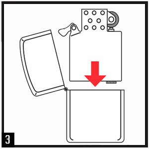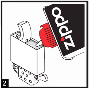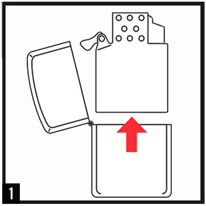 - после наполнения вставьте инсерт обратно в корпус зажигалки до упора, молоточком в сторону петли (3)