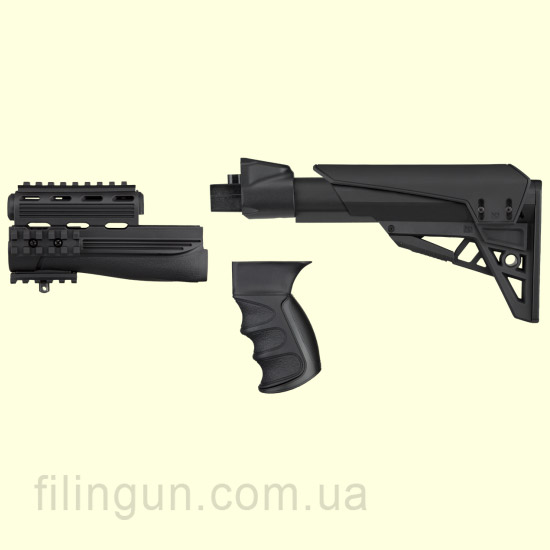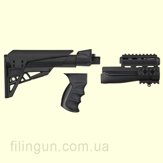 Обвес тактический ATI AK Elite Package (штампованная ствольная коробка) от американской компании ATI (Advanced Technology International). Предназначен обвес для замены штатного фиксированного приклада на автомате Калашникова со штампованной ствольной коробкой. Приклад телескопический. Трубка приклада выполнена с алюминиевого сплава 6061 T6 с профилем commercial spec и имеет шесть позиций фиксаций. Присутствует резиновый затыльник, который позволяет снизить уровень отдачи и сделать стрельбу комфортней. Также обратим ваше внимание на то, что пистолетная рукоять эргономичная и комфортная при удержании карабина даже при использовании перчаток стрелком. Цевье изготовлено из прочного полимера и имеет планки Weaver/Picatinny для установки различных комплектующих таких как: фонарь, тактическая рукоять коллиматорного прицела.
