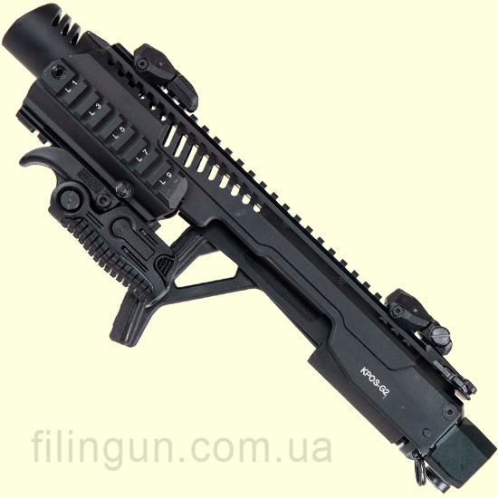 Обвес тактический FAB Defense KPOS G2 Glock 21 превосходное решение для модернизации вашего пистолета в карабин что позволяет во много раз увеличить функциональность и стабильность при выполнении задач, которые стоят перед стрелком. Данный комплект пользуется большим спросом у спортсменов стрелков, телохранителей, спецслужб и правоохранительными органами. Изготовлен из прочного анодированного алюминия марки 6061 T6. Взведение производится в стиле AR15 что позволяет производить это обеими руками. Складной узкопрофильный приклад с резиновый затыльник позволяющий снизить отдачу при стрельбе. Для установки глушителя требуется снять пламегаситель который крепится с помощью одного болта. Сверху присутствует полноразмерная планка Picatinny стандарта MIL-STD 1913 на которую можно установить открытые прицельные приспособления, оптический или же коллиматорный прицел. Также планки присутствуют по бакам для установки дополнительных аксессуаров, и одна планка в нижней части, на которую установлена рукоятка переноса огня, которая в сложенном состоянии имеет систему F-GGK Trigger Guard обеспечивающая безопасность, блокирует спусковую скобу. Установка очень простая и быстрая не требующая посещения оружейной мастерской.