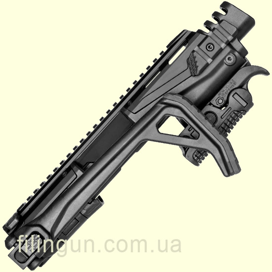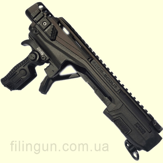 Обвес тактический FAB Defense KPOS Scout для Glock 17/19 Black превосходное решение для модернизации вашего пистолета в карабин что позволяет во много раз увеличить функциональность и стабильность при выполнении задач, которые стоят перед стрелком. Данный комплект пользуется большим спросом у спортсменов стрелков, телохранителей, спецслужб и правоохранительными органами. Верхний ресивер изготовлен из прочного анодированного алюминия марки 6061 T6, нижний ресивер из прочного армированного полимера, совокупность таких материалов обеспечивает превосходный баланс по весу. Взведение производится в стиле AR15 что позволяет производить это обеими руками. Складной узкопрофильный приклад с резиновый затыльник позволяющий снизить отдачу при стрельбе. Сверху присутствует полноразмерная планка Picatinny стандарта MIL-STD 1913 на которую можно установить открытые прицельные приспособления, оптический или же коллиматорный прицел. Также планки присутствуют по бакам со встроенными упорами для большого пальца и предназначены для установки дополнительных аксессуаров. Одна планка в нижней части, на которую установлена рукоятка переноса огня, которая в сложенном состоянии имеет систему F-GGK Trigger Guard обеспечивающая безопасность, блокирует спусковую скобу. Установка очень простая и быстрая не требующая посещения оружейной мастерской.