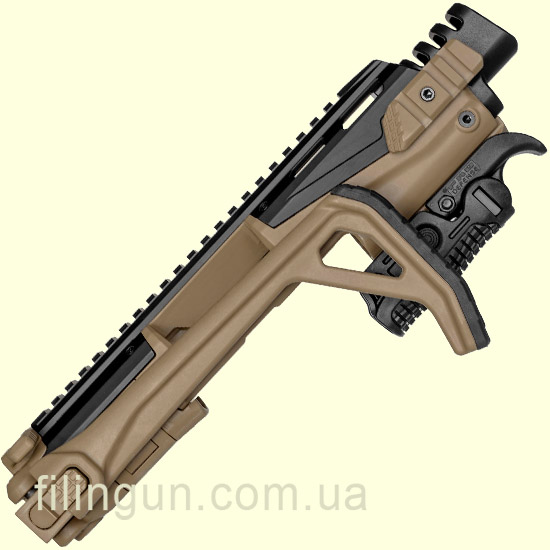 Обвес тактический FAB Defense KPOS Scout для Glock 17/19 Flat Dark Earth превосходное решение для модернизации вашего пистолета в карабин что позволяет во много раз увеличить функциональность и стабильность при выполнении задач, которые стоят перед стрелком. Данный комплект пользуется большим спросом у спортсменов стрелков, телохранителей, спецслужб и правоохранительными органами. Верхний ресивер изготовлен из прочного анодированного алюминия марки 6061 T6, нижний ресивер из прочного армированного полимера, совокупность таких материалов обеспечивает превосходный баланс по весу. Взведение производится в стиле AR15 что позволяет производить это обеими руками. Складной узкопрофильный приклад с резиновый затыльник позволяющий снизить отдачу при стрельбе. Сверху присутствует полноразмерная планка Picatinny стандарта MIL-STD 1913 на которую можно установить открытые прицельные приспособления, оптический или же коллиматорный прицел. Также планки присутствуют по бакам со встроенными упорами для большого пальца и предназначены для установки дополнительных аксессуаров. Одна планка в нижней части, на которую установлена рукоятка переноса огня, которая в сложенном состоянии имеет систему F-GGK Trigger Guard обеспечивающая безопасность, блокирует спусковую скобу. Установка очень простая и быстрая не требующая посещения оружейной мастерской.