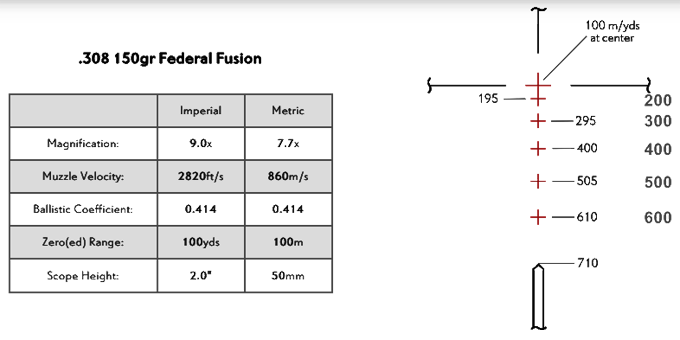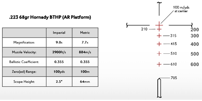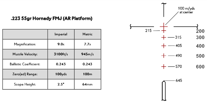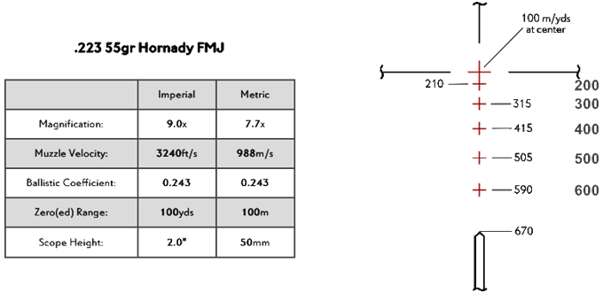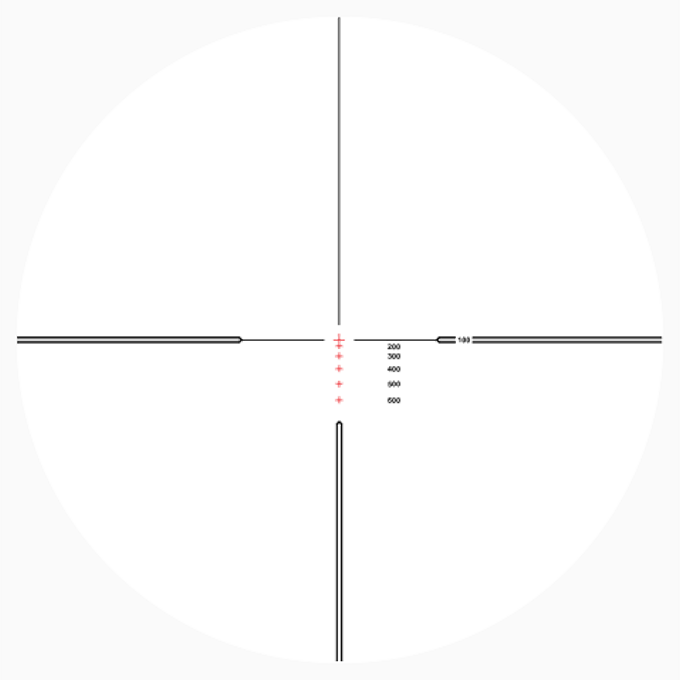 Расстояния, выгравированные в поле зрения сетки, оптимизированы для использования при максимальном увеличении, что обеспечивает максимальную эффективность при стрельбе на дальность. Эта сетка предназначена для использования с различными боеприпасами, включая .223/5,56 и .308.