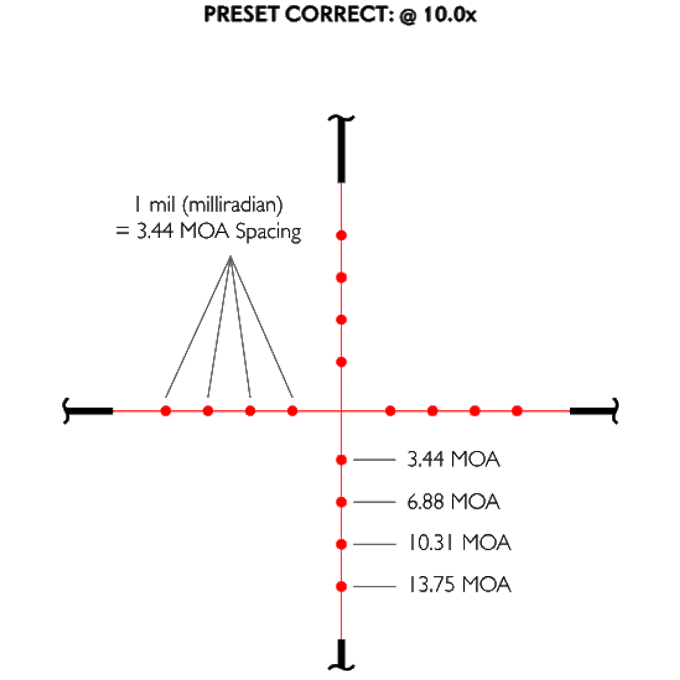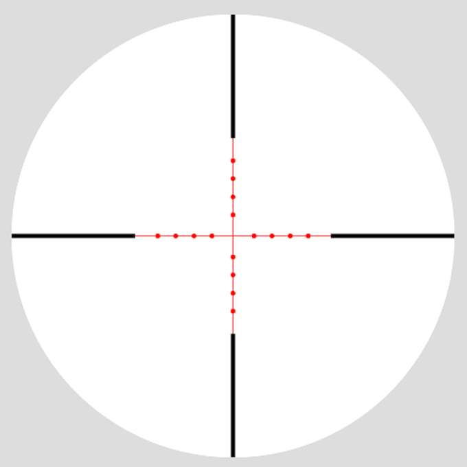 Классическая сетка Mil Dot обладает несколькими точками для прицеливания и удержания. При 10-кратном увеличении точные интервалы в милах представлены 4 точками в каждом направлении. Эта сетка выполнена в виде гравировки на стекле, обеспечивая 5 уровней яркости подсветки (красной и зеленой), а также возможность полного отключения подсветки для получения сплошной черной сетки.