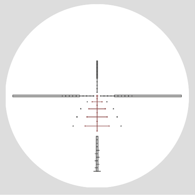 Точки прицеливания на нижней стойке прицельной сетки имеют увеличивающиеся в размерах промежутки. Это более точно отражает падение траектории пули; чем дальше летит пуля, тем быстрее пуля падает.