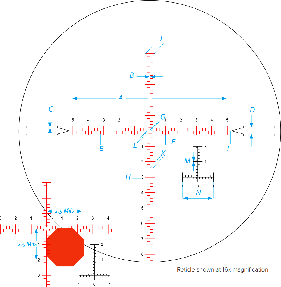 Nightforce MIL-C – это баллистическая прицельная сетка, разработанная для точной стрельбы на дальние дистанции. Сетка имеет простую центральную точку для точного прицеливания, в то время как основные линии имеют отметки по 0.2 миллирадиана. Каждый милрадиан обозначен числами для быстрого доступа даже в стрессовых ситуациях.