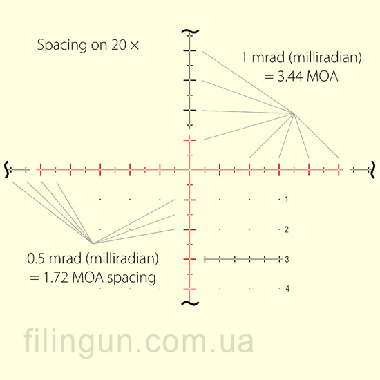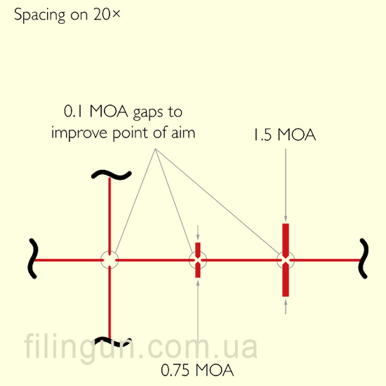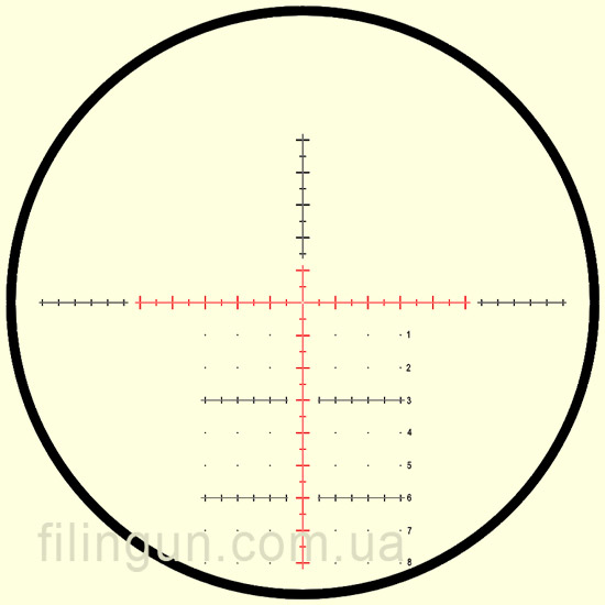 Дальномерная прицельная сетка TMX IR (улучшенный аналог Mil Dot), расположенна во второй фокальной плоскости и имеет красную (с плавной регулировкой яркости) подсветку центральной оси. Все размеры меток, а так же интервалов между ними на сетке имеют строго регламентированные размеры. При 20х кратном увеличении расстояние между основными метками составляет 1 Mil (угловая единица), что эквивалентно смещению точки прицеливания на 10 см на расстоянии 100 м, или на 1 м на расстоянии 1000 м. И еще одним, не маловажным, преимуществом является то, что сетка выгравирована на стекле, что дает ей 100% защиту от влияния разновекторной отдачи пружинно-поршневой пневматики, она не подвержена коррозии и влиянию солнечных лучей, и отличается повышенной прочностью и надежностью.