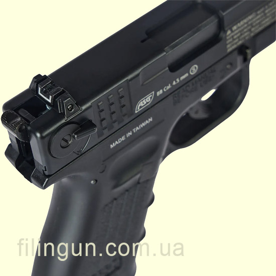 ASG ISSC M22 Blowback оснащен удобным предохранителем, прицельными приспособлениями с белыми точками для быстрой наводки на цель и планкой Пикатинни для установки дополнительных аксессуаров — лазерных целеуказателей или фонарей.