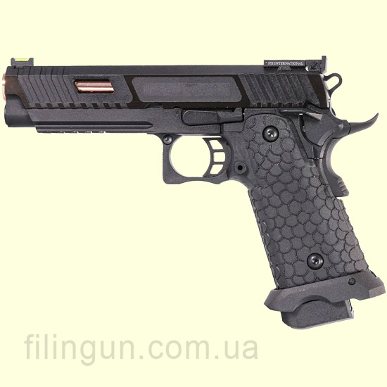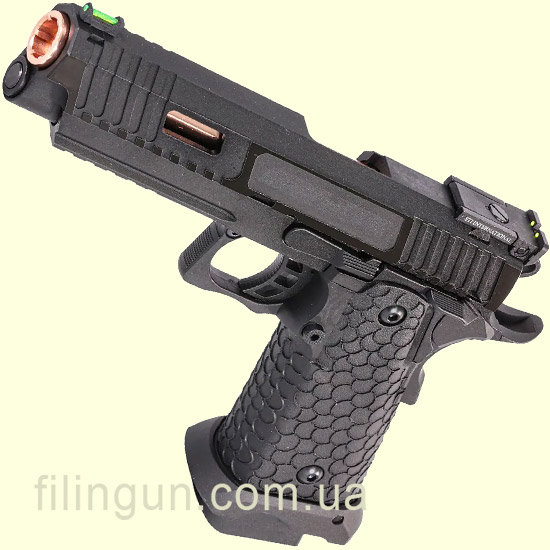 Рамка пистолета изготовлена из пластика, а кожух затвора из прочного металла, что придает ему солидный вес и ощущение настоящего огнестрельного оружия. Эргономичная рукоять удобно лежит в руке, а качественная текстура обеспечивает уверенный хват даже при длительной стрельбе. Визуально ASG STI Combat Master выглядит максимально аутентично — от формы затвора до фирменной маркировки.