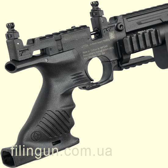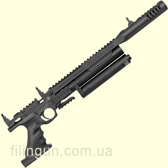 Нарезной ствол длиной 300 мм дополнен интегрированным саундмодератором, который снижает уровень шума и делает использование пистолета комфортным как на стрельбище, так и в тире. Для удобства стрельбы с примкнутым прикладом предусмотрен дополнительный складной целик, а планка Picatinny позволяет установить сошки или переднюю рукоять для более стабильного удержания оружия.