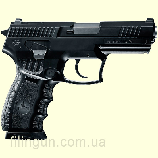 Пистолет пневматический Umarex IWI Jericho B – лицензионная копия нового 9-мм пистолета из Израиля от компании Umarex стреляющий с помощью баллонов CO2 стальными шариками BB калибра 4,5 миллиметра. Начальная скорость составляет 115 метров на секунду, а магазин вмещает 23 шарика. Затворная рама подвижная изготовлена из метала, но без функции Blowback. Снизу рамки пистолета присутствует планка Weaver для возможности установки дополнительного оборудования. Купить его вы можете у нас в интернет-магазине Filingun.com.ua сделав заказ по телефонам указанных в шапке сайта или же через форму сайта.