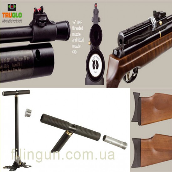 Пневматическая винтовка Hatsan AT44W-10 с насосом Hatsan системы PCP. Это когда вы в резервуар, который находится под стволом, с помощью специального насоса высокого давления, накачиваете сжатый воздух под давлением до 200 атмосфер. Приклад винтовки выполнен с дерева. Винтовка идет десяти зарядная. Так же на винтовку можно установить оптический прицел. У винтовки нет отдачи, на неё можно поставить абсолютно любой оптический прицел. Перезарядка винтовки происходит как в биатлонистских винтовках. Мушка и прицельная планка оборудована световолокном, что позволяет стрелять более точно, так как мушка и прицельная планка не сливаются между собой. Так же на пневматическую винтовка Hatsan AT44W-10 можно установить глушитель.