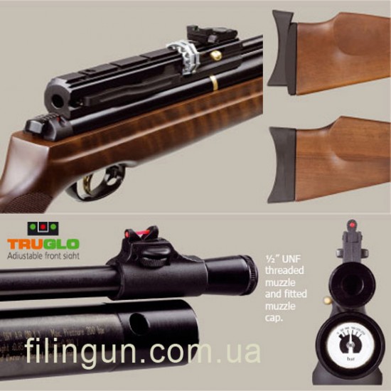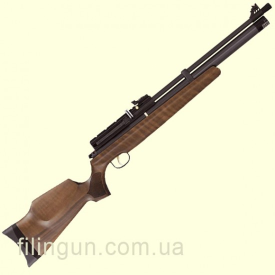 Пневматическая винтовка Hatsan AT44W-10 системы PCP. Это когда вы в резервуар, который находится под стволом, с помощью специального насоса высокого давления, накачиваете сжатый воздух под давлением до 200 атмосфер. Приклад винтовки выполнен с дерева. Винтовка идет десяти зарядная. Так же на винтовку можно установить оптический прицел. У винтовки нет отдачи, на неё можно поставить абсолютно любой оптический прицел. Перезарядка винтовки происходит как в биатлонистских винтовках. Мушка и прицельная планка оборудована световолокном, что позволяет стрелять более точно, так как мушка и прицельная планка не сливаются между собой. Так же на пневматическую винтовка Hatsan AT44W-10 можно установить глушитель.