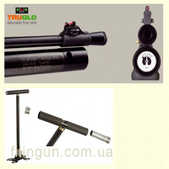 Новая модель пневматической винтовки системы РСР в комплекте с насосом Hatsan. Сменный десяти зарядный барабан ручной загрузки, задний затвор взвода. Баллон предварительно заряжен. Ствол винтовки нарезной. Есть возможность установки глушителя. Для установки требуется открутить крышечку на конце ствола. Эргономичный приклад из Турецкого ореха оснащен резиновой вставкой для лучшего сцепления с предплечьем. Высота щеки приклада легко отрегулировать при помощи монеты. Баллон съемный, что дает возможность использовать запасные баллоны. Встроенный манометр на торце баллона позволяет контролировать давление. Место для крепления оптического прицела типа ласточкин хвост 11 и 22 мм шириной. Регулируемые прицельная планка и мушка для удобства прицеливания оснащены световолокном. 2-х ступенчатый регулируемый спусковой механизм. Поставляется в комплекте с ремнём для ношения винтовки на плече.